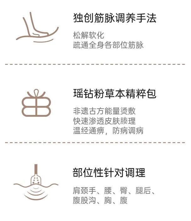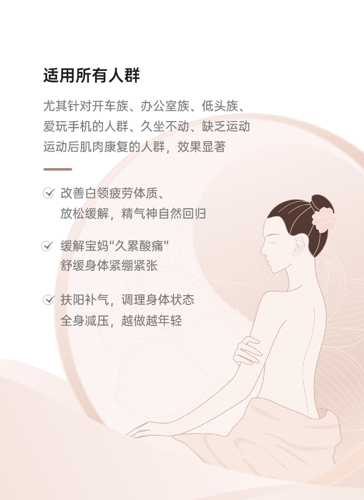 运用独特筋脉疏通手法,通过推、拨、揉,松解软化、疏通全身各部位筋脉,减缓身体因筋脉不通引起的各种不规则疼痛,提升机体温度、排寒祛湿、舒筋活络,提高身体阳气,平衡气血、补充能量,提升人体自身免疫力。